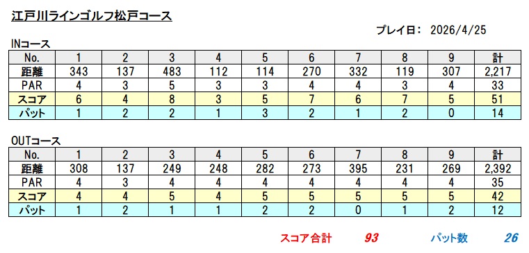 93。何とかOUTコースで巻き返しましたが、ダメですね。